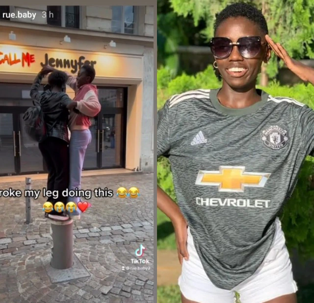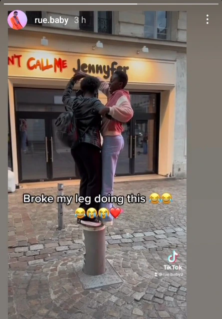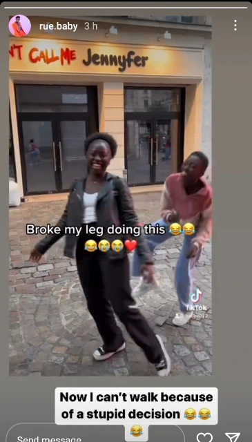 “Broke my leg doing this…now I can’t walk because of a stupid decision.” Rue Baby wrote on her Instagram.